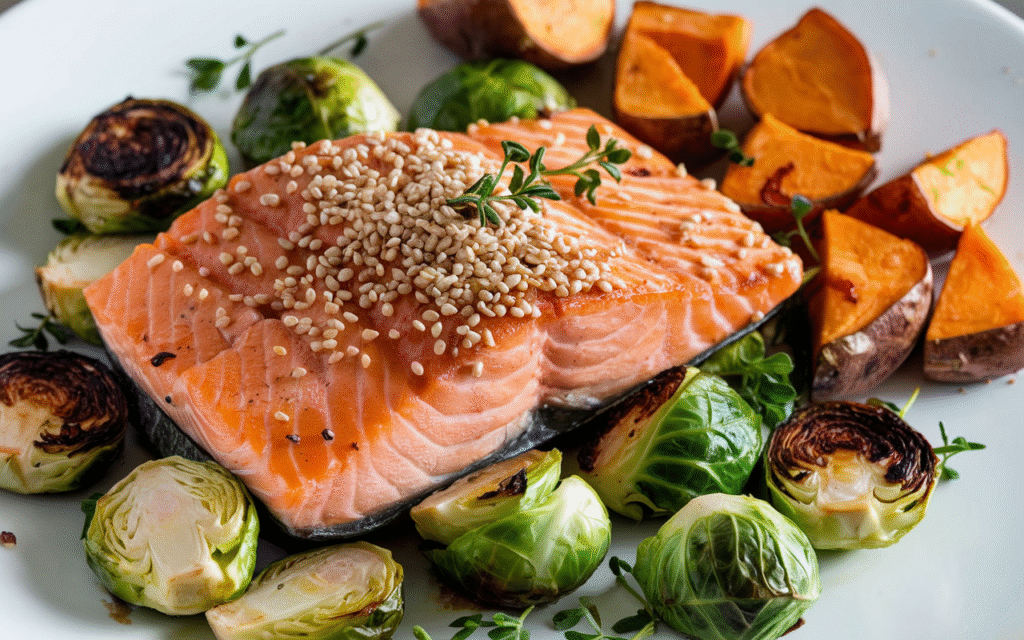- Dinner: Grilled salmon with roasted Brussels sprouts and sweet potato